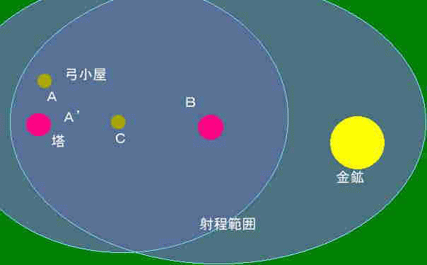 理屈としてはこんな感じです。A(A’)→B→Cで建てていきます。成功確率UPのために町の人は2人いた方がいいでしょう〜。AとA’は同時に建つようにするか、弓小屋が先に建つようにしましょう。Bは両射程内に建てます。
