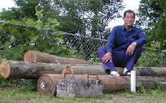 上の写真は撤去した電柱で、5mほどの物が10本あります。これを利用してベンチができないかと思い、近所に住むS先生に相談しました。早速S先生はチェーンソーを持ち込み、両端を30cmずつ切断してくれました。