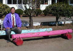 その後暇をみつけては、台になる部分をのみでけずり、作業を続けました。途中から教務主任のK先生が手伝い、ペンキ塗りもしてくれました。購入した金具は5000円程度で済み、頑丈なベンチの完成となりました。完成(5台)の写真は11月です。