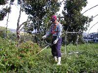 三月末から育てたスイカのハウスも、保護者の方が撤去しましたので荒れ放題の状態です。8月に草は刈りましたが、そのままにしていました。そこで一念発起。平成13年10月18日に考えついたのが、骨だけになっているパイプを利用して、ビニルハウスを作ることにしました。まずは除草です。愛用の草刈くんを使って、伸びていた草を刈りました。頭の中は完成のハウスの姿を想像していますから、草刈りも苦痛ではありません。