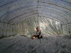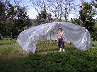 朝の10時から開始して、完成したのは午後2時でした。張ってみて分かったのですが、ビニルシートの長さは30mを超えていました。床面積は10m×6mです。温度計を持ち込んだところ、34℃まで上昇しました。さて、ここをどのように利用するかと夢が膨らみます。種まきした苗を育てる場所に、霜で枯れてしまう熱帯植物の温室に、雨の日の作業場にといろいろ考えています。山北の冬は寒いのです。