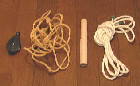 D ひもの両端に、先ほどの木の棒を結びます。一個を結んだら、もう一個は長さを調整します。椅子に座った状態で、両手で持って、二個とも鼻の前にくるようにします。一時間で完成です。