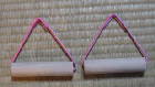 B 20cmの木の棒を二つに切ります。次にハンガーを切り、直線部分を利用します。木の棒に針金を通し、ペンチでまげます。写真のように三角形として、上部にひもが掛けられるようにします。