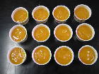 プリンの容器を並べて、ペットボトルの石鹸を流します。容器の八割程度まで入れたところ、12個完成しました。これで2リットル入りのペットボトルを使用すれば、900ccの廃油せっけんを作ることが可能です。容器に流すまでは30分程度で済みますから、意外と簡単でした。