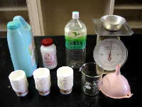 今回の実験は、ペットボトルでもっとたくさん廃油せっけんがつくれないかというものです。最初に作ったせっけん材料を、すべて二倍の量にしてみました。