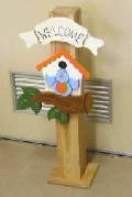 この写真は、ドアストッパーです。ドアが開いた状態にならないので、三年生の掃除当番が困っていました。そこで、高さ90cmの角材を利用して、小鳥・巣箱・幹・ウエルカムを別々に貼りました。すべて廃材です。しかし、色を塗れば立派な作品です。保護者の方がやってきて、「いやーー、かわいい」と言いますので、鼻高々です。