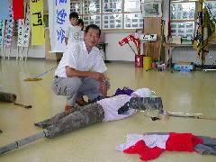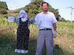 9月17日のことです。運動会の練習が行われていた頃、五年生が学校田にかかしを作って立てました。しかし、大きいだけでとてもかかしとは思えません。このままでは、村の人のために説明板を立てなければなりません。まるでお化けかかしか、宇宙人のようです。そこで、私もかかしを作り、立てることにしました。古着も竹もわらも、何でもそろう学校です。造り始めれば、2〜3時間で完成です。
