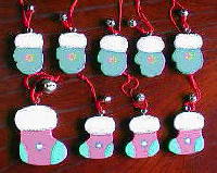 厚さ1cmの板をミシンのこで切り、トールペイント用の絵の具で着色しました。手袋と靴下の形ですが、なかなかかわいい作品になりました。金具を取り付け、鈴とリリアンも付けました。型紙を作っていますので、大量生産できます。表裏の両面とも着色しています。小学生にプレゼントすると、ほとんどの子がランドセルに下げています。ときどき、母親から取られたという子どももいます。ある先生は学校のマスターキーにつけていますが、使いやすいということでした。