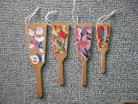 小さな羽子板のキーホルダーです。熊本菓子博の会場に展示されていたものを、早速真似をして作りました。長さは7〜10cm程度です。板の厚さは5mm程度ですが、もっと厚い板でもいいでしょう。きれいな絵は、千代紙を貼ったものです。羽子板のカドに穴をあけ、ひもを結びました。これも型紙を作っていますから、たくさん作れます。