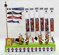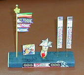 「吹流し」と「こいのぼり」は、人形店のホームページからダウンロードしたものです。やはり大きなサイズの写真がいいようです。「矢旗」と「陣羽織」は、新聞折込のチラシの写真をスキャナで取り込みました。「まさかり」は手作りですが、柄はつまようじを利用しました。こいのぼりを貼り付けた棒は、焼き鳥用の串や直径3mmのひのき棒がいいでしょう。風車や金色の球は、手芸店で手に入ります。台は手元にあった板を切り、色画用紙を貼りました。横20cm縦5cm高さ3cmほどです。