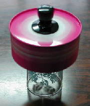今回は、不二家のぺこちゃんキャンディが入っていた缶を利用しました。缶の内側には魚釣り用の板鉛(幅15mm)を貼り付けています。これは両面テープを利用すれば、簡単に貼れます。厚さ0.4mmで長さ30cmの板鉛を、4枚貼っています。次に100円ショップのなべのつまみを取り付けるために、ドリルで中心に穴をあけます。バランスを取る必要がありますので、穴はすこし大きめにあけます。なべのつまみはアルミのネジでしめるようになっていますが、その先に瞬間接着剤で押しピンをつけます。これで完成です。こまをまわす台は、どこの家庭にもあるコップです。底がすこしへこんでいる物が扱いやすいです。