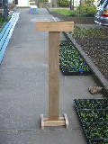 皆さんは、めくり板をご存知でしょうか。ステージの横に置いて、プログラムの紹介をするものです。井芹中には小さなめくり板はありましたが、古いために使用できなくなりました。そこで、高さ120cmの高さにして、上部は二枚の板ではさんだ形にしました。このようにしておくと、プログラムが多いときは両面で使用できます。12cm角の木材にしたかったのですが、重くなると運搬に苦労します。仕上げもしていないのに、生徒会が使いました。文化発表会に、そして子ども文化会館での弁論大会でも使ってくれました。ところで材料費は、何と 0 円なのです。すべて自宅近くの建築現場から拾ってきました。これからも活躍してくれることでしょう。