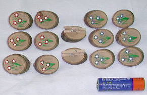 山北小学校の近くにはいろんな木の枝が落ちています。サクラ・ミカン・ウメなどさまざまです。今回は細いサクラの枝を斜めに切り、木製クリップを木工ボンドで貼りました。乾電池の長さは5cmですから、サクラの幅は3cmでしょうか。木製クリップは手芸店にあります。絵はトールペイントの絵の具で描きました。私のお手伝いをしてくれる児童に渡していたら、残り少なくなりました。