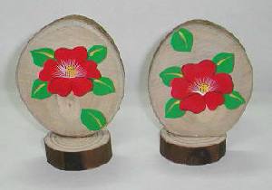 高さ15cmほどの「メモスタンド」です。つばきの絵を描いてみました。裏側には、木製の洗濯ばさみをボンドで貼っています。杉の台は、ホームセンターで買った杭を切った物です。学校へ来た人にプレゼントしたら、にこにこして持って帰りました。
