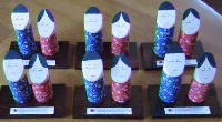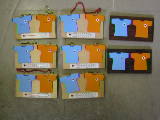この作品は、横11cm・縦6cmの小さなものです。もらいものを利用して作ったのですが、Tシャツに色を塗って貼っただけです。実用的になるように、温度計をつけました。他にもいろんなパーツがありますので、おもしろい物がたくさん作れそうです。学校で作業など協力してくれた生徒に、感謝状のつもりでプレゼントできそうです。