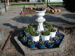 花が好きで、空き地があれば植えています。先日保護者のYさんから、パンジーとビオラの苗を10ケースほどいただきました。さてどこに植えようかとはやる心を抑え、学校を見てまわりました。以前から気になっていたこの六角形のセメント囲いは、小鳥小屋だったそうです。大きな台風で吹き飛び、そのままになっていました。そこで、学校に散乱していた植木鉢を集め、ビオラを植えました。平成14年1月30日のことです。高さが異なるように工夫しましたので、ご覧のように立体的な花壇となりました。3年生の女の子が「わぁ先生、きれい。」と言いますので、思わず私のことかと思いました。
