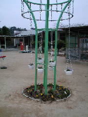 山北の子どもたちに、永年親しまれた遊具がこわれました。鎖が腐食して危険なので、鎖だけ撤去されました。この3mの支柱4本が、何とか生かされないかと考えました。やはり、花壇が一番です。踏み固められた土を掘り起こし、腐葉土と牛ふんを山のように入れました。下のパイプの中には、パンジーを30株ほど定植しました。次に吊り鉢を購入して、6鉢をくさりで吊るしました。鉢にはビオラを植えています。もっと高くしたいのですか、水かけが大変です。2年生の男の子がやってきて「わぁ先生、頭のよかですね。」と言いますので、答えました。「頭じゃなか。良かつは顔たい。」 平成14年2月5日のことです。