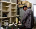 門松を作ったとき、孟宗竹が残りました。そこで、長さ40cmほどに切り、片方は竹の節で斜めに切りました。これを、ボンドで板に接着しました。さて、これを私の秘密の場所(工作室〜昔の理科準備室)へ持ち込み、正月飾りの製作です。この場所を公開するのは、これが最初かもしれません。ここで廃油せっけんを作ったり、子どもたちのための工作をします。ここは更衣室も兼用にしていますが誰も来ませんし、棚がたくさんありますので道具類の保管場所にもなっています。