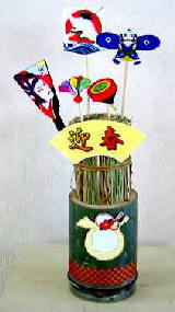 ホームページで見かけ、早速参考にしました。学校田に置いてあるワラを束ね、ひもで結びました。これを切りそろえ、孟宗竹の中に固定しました。作ってみて分かったことですが、切り口のすぐそばも結んだほうが作業が楽です。また結ぶときは、輪ゴムで仮止めしたほうが形がくずれません。これで台になる部分が完成です。さてパソコンに保存している羽子板・羽・コマ・タコ・門松など正月にちなんだ物を、プリンターで印刷しました。その後ハサミで切り、串焼き用の竹串をボンドでつけました。台もパーツも費用0円です。