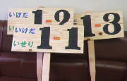 縦20cm、横50cmのサイズです。学級単位に表示するので、三個必要です。60cmの杭は購入しました。大きな文字は、以前作っていた型紙を利用したものです。これは日めくりカレンダーの文字を厚紙にはり、カッターナイフで切りました。大小二種類を保管しています。