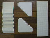 | 方眼目盛が印刷してある工作用の厚紙があります。これを使ってひな壇を作ります。左の写真は糊付けの状態です。幅15cmです。高さは17cm、奥行きも17cmです。階段状は、5.3.3.3.3.3.3.3.3.5 となっています。鉄筆で線に沿って折り傷をつけます。谷と山の繰り返しです。側板の二枚にのりしろをつけて組み立ててみました。背にも底にも厚紙を貼ります。右の写真が、完成したところです。 | ||