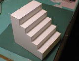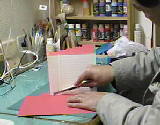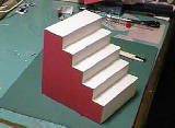 | この箱に赤の色画用紙を貼ります。背や底は簡単ですが、階段状の所は込み入っています。切ってから貼るのでなく、貼ってから切ります。その方が、仕上がりもきれいです。写真はカッターで切り離しているところです。側と背と底の4面は画用紙で貼ります。このひな壇はひっくり返しても同じサイズですから、仕上がりのよい方を上に持ってきます。 | ||