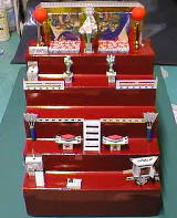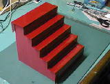 | さて、一番美しく仕上げたいのがこの階段です。ここだけ、17cm幅の赤のつや紙を用います。柔らかいので折り目をつけておく必要はありません。むずかしいのはのり付けです。左右に1cmずつ出ていますから、目印がありません。一番下まで1cmは確保しなければなりません。一段ずつボンドをつけて貼っていきます。強力ですから、曲がっても修正できません。のりをつけた後、何度も指で押さえますと汚れます。それで30cmものさしで押さえます。右は、小道具をとりつけた状態です。 | ||