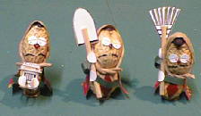 スコップと松葉かきを持っています。柄の部分は竹串です。一人は、内裏のげたを持っています。この三人の特徴は、頬かむりです。荷造り用の紙ひもを15cmくらいで切って、中央部分のねじれを戻し、開きます。そこに頭をいれて、結びます。こよりでもいいのです。ところで、三人とも赤のよだれかけをしています。