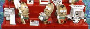 横17cmの幅に、人形三体と小道具を乗せました。すべてボンドで貼っています。できるだけユーモラスに作るよう心がけています。この三人だけ鼻ひげを生やしました。メガネもかけさせたいのですが。