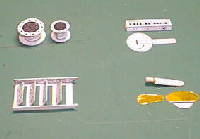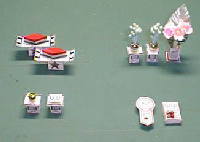 | 型紙から作った小物です。これだけでも時間はかかります。ひし餅もバルサ材をひし形に切り、着色した三枚を張り合わせます。花も大変です。手芸店に入ることから悩まなければなりません。お金を払うとき、手は震え、声は上ずり、額から汗が流れ、顔は真っ赤になっています。それほどうぶな私なのです。 | ||
