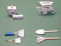 | 現代風のひな飾りにしています。楽器にはギターやキーボード、小物にも電化製品を備えます。チャンネルやボリュームのつまみはビーズです。金と銀の水引は矢に利用しますが、宇土の文房具店に行って購入します。スコップと松葉かきがあります。柄の部分は竹串ですが、先の方をカッターで割り、差し込んで糊付けしています。 | ||