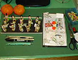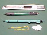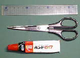ひな人形作成の道具です。カッターナイフ・鉄筆・シャープペンシル・糸通しです。ペンシルの中には、待ち針の頭を切り落とした針が入れてあります。目鼻など小物は、これで付けます。糸通しは、ピーナツの殻にリリアンを通すためのものです。接着剤はボンドG17です。ピーナツの色に近いことと紙にしわをつけないので、これだけを使います。 | ![]() |