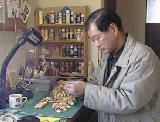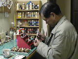 ひな飾りには15体の人形が必要です。人形に小物を持たせている作業です。ボンドが乾いていないのに動かすと不都合ですから、12×20cmのマグネットシートを作業台にしています。右はひな壇に人形を付けているところです。家族も寝静まった深夜、くらーい雰囲気でしております。 | ![]() |