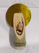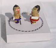 作品主題 − 「すもうとり」 昔こんな玩具がありました。箱を指でたたいて勝負をするというものです。手と腕はケント紙で作りました。髪はサインペンで描き、まわしはひもです。ピーナツの底には押しピンをボンドで接着しています。何度か実験しましたが、突然ひっくり返るので笑いを誘います。秋の夜長に皆さんも作りませんか。