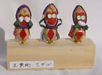 作品主題 − 「木葉猿」 熊本県玉東町には郷土玩具「木葉猿」があります。本物は土で焼いた物で、三匹の猿を表現しているので三ザルとも言います。三匹の猿は、見ざる・聞かざる・言わざるの形を示しています。そこで目を押さえたり、耳を押さえたり、口を押さえています。自宅に実物がありますのでよく見たら、並び方が逆でした。見ざるが右側でした。