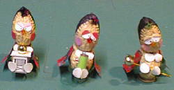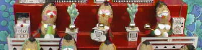 三人官女の出番です。さかずきは金杯です。六角形のスパンコールを使って、台に載せました。とっくりは、ストローに紙を貼りました。ボンドでつけにくいのは、しゃくしです。少しだけ身体に溝を掘りました。右手は下から、左手は上から持つように腕の付け方を工夫したつもりです。下着も着けています。