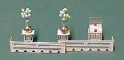 手すりが二枚です。のりしろはありません。鏡台も作りました。鏡の代わりに、銀紙を貼っています。官女の間に飾る花が二つです。市販されているひな飾りでは、普通丸いもちになっています。