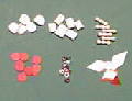 ▽手になるパンチの穴・バルサ材のげた・爪楊枝の先で作ったひな人形が遊ぶひな人形のおもちゃ・パンチのほほ・鼻になるビーズ・赤紙のはらまき ▽黒の烏帽子・和紙の着物・バルサ材のひし餅・竹串の笛・扇子等に貼る金銀の紙・花瓶にさす花 |