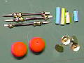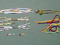 ▽金と銀の水引・水引の矢の柄・水引の杓子・水引のアンテナ・五色のリリアン ▽黒く塗った爪楊枝(ぼんぼりの台)・ストローと折り紙のビーズで作ったとっくり・釣り具のウキ(ぼんぼり)・人形の台になる押しピン |