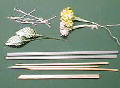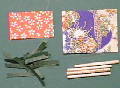 ▽着物につかう和紙・ひな壇の緋毛せんに貼る和紙・屏風に貼る金紙・造花に使う緑のテープ・荷造り用の紙ひも ▽造花用のおしべ・小さな造花・造花用の葉・ストロー・竹ぐし・バルサ材 |