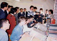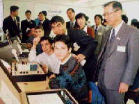 ここが電気の実習棟です。男子がほとんどです。左は電気配線の基礎をしている場面です。右はオシロスコープを使った実験のようです。 ここには学生寮もあります。ここで学んだ生徒はやがて技術者として独立するでしょう。 |