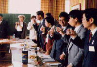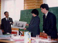 | 気温はマイナス5度Cです。そんな中でここ職業中等学校を訪問しました。広間で校長先生の説明がありました。まだ朝でしたが、53度の自家製お酒で乾杯です。この学校は14歳から18歳までの生徒が学んでいます。内容は、建築・服飾デザイン・自動車・溶接・電気等です。日本でいえば工業高校です。ここに服飾デザインの実習室がありました。電気関係の実習棟は、別のところにあります。右の写真は、日本から持っていった子ども達の作品を、校長先生にプレゼントしているところです。 | ||||
