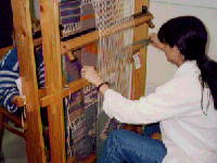| 体育館でダンスの練習をしています。天井が低く、バスケットやバレーボールはできないでしょう。施設・設備は恵まれていません。しかし、子ども達はみな生き生きとした表情で活動しています。中央は音楽の時間です。地下にいきますと、専門コースの織物をしているところです。 | ||||