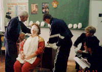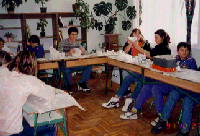 | ここの校舎は、以前の炭坑の寮だったものを改装してあり、地上3階地下1階の建物です。一クラスは10人程度で、教室は日本の半分くらいの広さです。国語の授業と、美術の授業の風景です。一人ずつ自分の顔のマスクを石膏で作っているところです。 | ||||