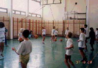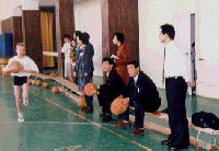 体育館でのバスケットボールの練習風景です。体育の先生方が多かったのか、やがて試合になったら、参加していました。 | ![]() |