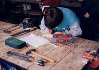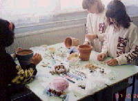 | 美術の授業です。中央は、身の回りの素材(松かさ・葉・どんぐり)を使って植木鉢に貼っていました。きっと作品は自宅で使用するでしょう。右は技術の授業です。この雰囲気は日本と全く同じです。私も子どものころは、工作少年でした。 | ||||