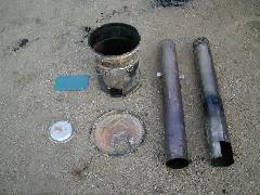 まずふたつきのオイル缶です。これは自動車整備工場にお願いすれば、分けてもらえます。必ずふたも一緒にもらってください。缶の中にオイルが残っていたら、古布で拭いて一度新聞紙や小枝などを入れ燃やしてください。オイル缶が炭焼き窯になるわけですから、長く使用することはできないでしょう。
