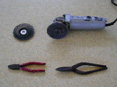 写真は、オイル缶の加工をするための道具です。グラインダーはオイル缶の穴あけ、ふたの穴あけ、煙突の切断に使用しました。ペンチは、ふたのふち(花びらもよう)を広げるのに使用しました。カナキリハサミは、空気調節用のブリキ板を切るのに使用しました。グラインダーの刃は、研磨用や切断用などありますので、確認して使ってください。今回は勤続切断用の刃を用いました。使用にあたっては、安全対策をしてください。小学生に使用させると、危険です。