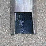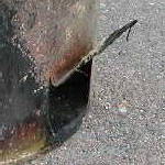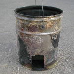 切断の作業が済んだら、この部分を写真右のように上に折り曲げてください。この部分に煙突が乗ることになります。切り口が危ないと思うときは、角をグラインダーでみがいてください。これでオイル缶の穴あけは完了です。