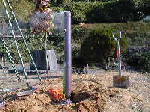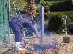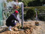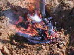 6 ふたをかぶせたら、さらにふたの穴からうちわで空気を送ります。それが右の写真です。煙が煙突から出ていますので、対流が始まろうとしています。確実に竹に火がついていて、対流が起これば、あとは自然に炎は下方へ燃えていきます。このとき、穴の近くの竹は炭にならずに、灰になります。